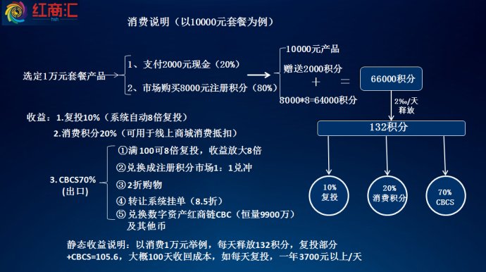据红商汇招商人员介绍,在红商汇投资1万元购买“套餐产品”除获得相应产品,还将获得6.6万的积分,按照红商汇的规则,一个积分就相当于一块钱。这些积分不会一次性直接到帐而是按照每天千分之二进行释放,也就是说投资者每天获得132个积分直至全部6.6万积分到帐。到帐的积分可以卖给其他会员,也可以按照一对一的模式转换成红商汇发行的数字货币红商链,招商人员透露这些红商链也有强大的增值空间。