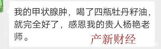 不光各种套路拉人头,湖南香四海农业科技有限公司还吹嘘喝该公司生产的油可以治病。产新财经发现,该公司多个市场营销群,不断有人在喊“我的甲状腺肿喝了四瓶牡丹籽油就完全好了,感恩我的贵人。”“喝了牡丹籽油我的便秘也调理好了。”为了忽悠会员消费,该公司鼓吹喝油可以治病可谓令人乍舌。