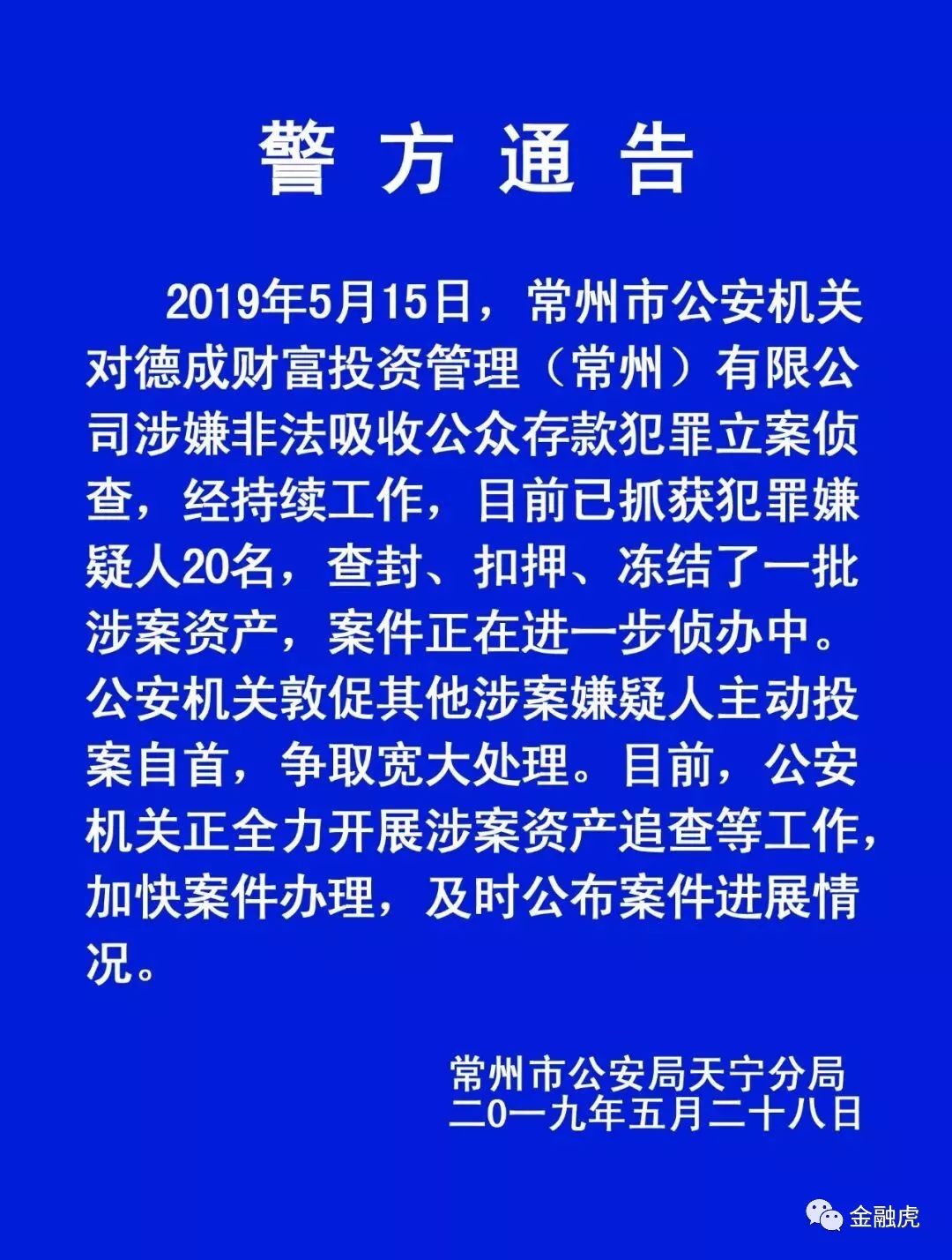 道道网讯 5月28日消息,今日,常州市公安局天宁分局发布最新通报显示,2019年5月15日,常州市公安机关对德成财富投资管理(常州)有限公司涉嫌非法吸收公众存款犯罪立案侦查,经持续工作,目前已抓获犯罪嫌疑人20名,查封、扣押、冻结了一批涉案资产,案件正在进步侦办中。