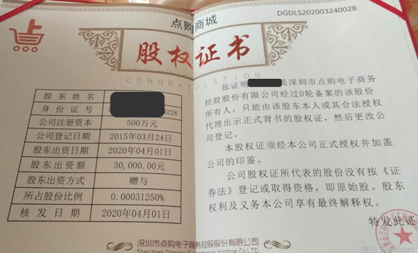 为了刺激用户购买“点购商城”代理,深圳市点购电子商务控股股份有限公司还鼓吹赠送一级代理“股权”,花3万就送3万股权、花6万就送6万股权,“未来公司要在纳斯达克上市,本轮公司估值已到96亿元”。以上市后高额回报的噱头,刺激用户买高级别代理,同时,以远超银行利息吸引会员投资理财吸纳资金。