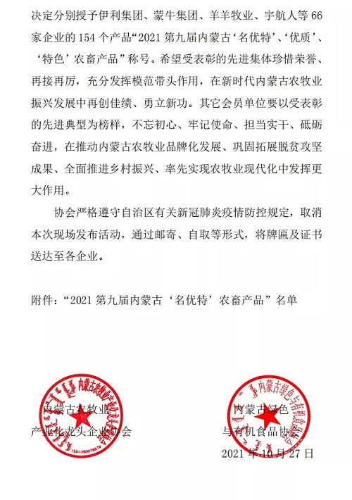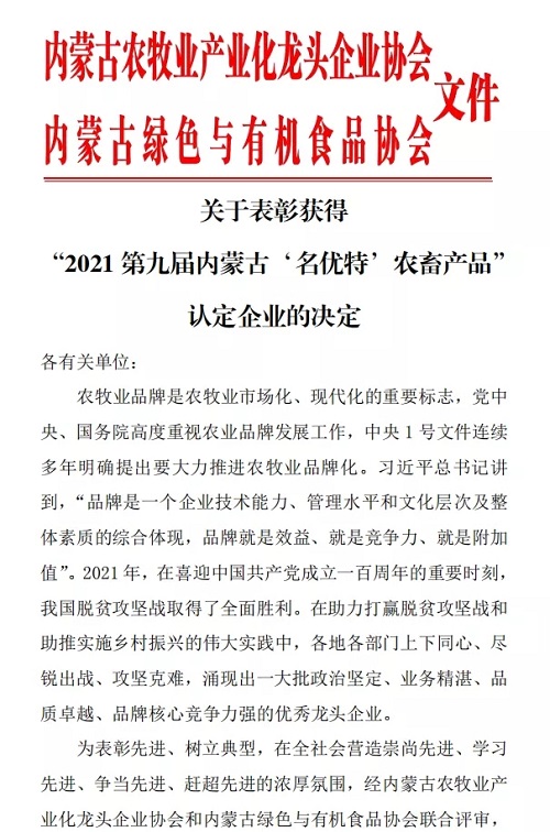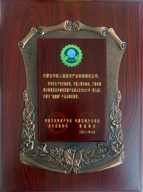 道道网讯 宇航人公司曾多次被评为内蒙古名优特企业,2021年与伊利、蒙牛、羊羊牧业等66家企业的154款产品被评为2021年(第九届)内蒙古“名优特”产品称号。其中包含宇航人沙棘原浆、宇航人牌沙棘油、千喜寿源牌沙棘番茄茶多酚软胶囊三款产品。