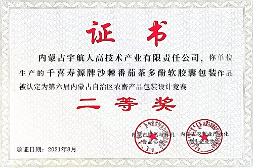 同时千喜寿源牌沙棘番茄茶多酚软胶囊包装荣获第六届内蒙古自治区农畜产品包装设计竞赛二等奖。