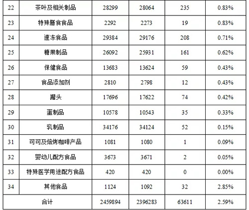 2021年第三季度,全国市场监管部门完成食品安全监督抽检2459894批次,依据有关食品安全国家标准等检验,检出不合格样品63611批次,总体不合格率为2.59%,较2020年同期上升0.37个百分点。