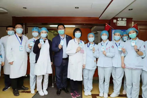 2020年5月,双迪将霸王鲨防护卡等防护物资送到大连医科大学附属大连市友谊医院健康管理中心医护人员手中。