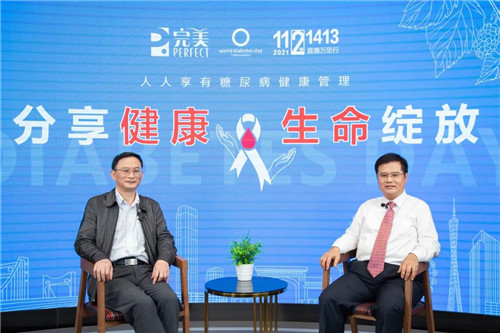 继11月14日中山地标完美金鹰大厦与全国各地标志性建筑一起点亮“抗糖”蓝光后,本次直播特别邀请到广东省中医特色重点专科专科负责人、广州中医药大学教授林泽宏医师与完美(中国)有限公司CEO特别助理兼市场中心总经理张旭辉先生共同探讨糖尿病的健康防治,详细剖析了糖尿病的现状、分类、成因等,以及糖尿病治疗的“五驾马车”,远离高血糖,还得从合理膳食、适量运动的健康管理做起,从你我做起,科学抗糖,助力健康中国行动!