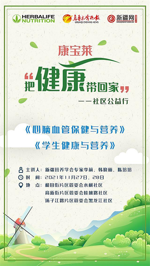 即将启幕的“把健康带回家”社区公益行活动,围绕三大社区开展健康讲堂,邀请新疆营养学会专家李莉、韩晓丽、陈培培,现场讲授《学生健康与营养》、《心脑血管保健与营养》等健康知识讲座,通过专业的营养知识宣讲,让参与者更好的了解营养搭配等相关内容。
