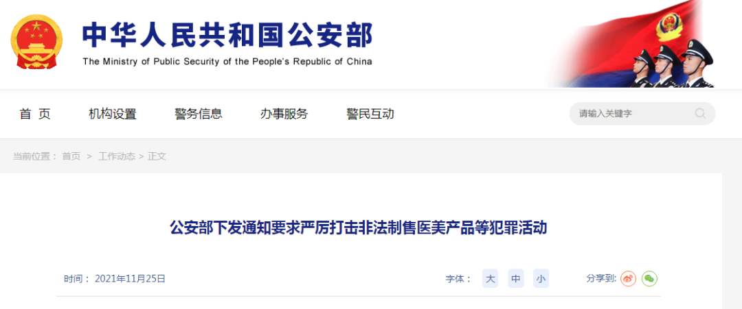 针对一些地方医疗美容领域制假售假、非法从业、发布虚假广告、借“医美贷”实施诈骗等违法犯罪突出,导致医美事故频发的情况,公安部食品药品犯罪侦查局近日下发通知,结合深入开展“我为群众办实事”实践活动,部署进一步加大对非法制售医美产品等药品安全领域突出犯罪活动打击力度,切实保障人民群众身体健康和生命安全。