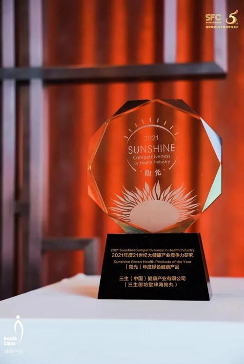 2021年11月5日,第五届中国大健康产业峰会在深圳举行。凭借在中医养生方面的突出表现,“三生御坊堂牌海狗丸”入选21世纪大健康产业竞争力研究“阳光”荣誉榜,荣获“年度绿色健康产品”称号。这是三生继东方素养肽素乳之后获得该称号的第二款产品。