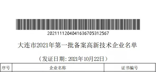 10月22日,双迪创新科技研究院被认定为大连市2021年第一批备案高新技术企业。