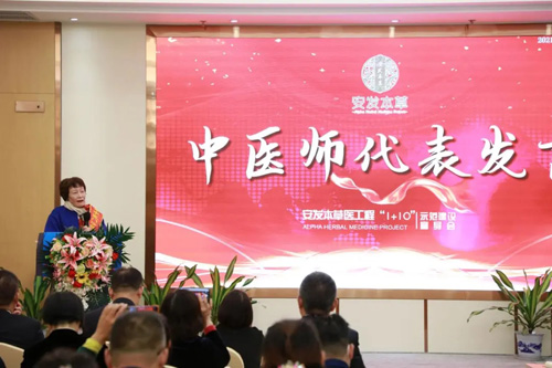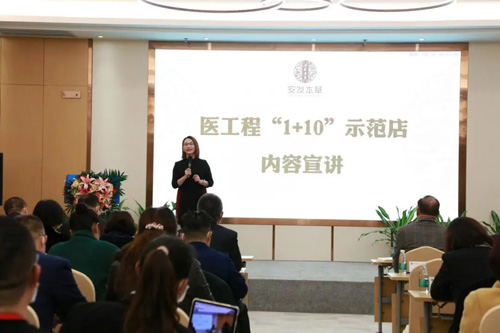 安发本草副总经理吴彬女士作“医工程‘1+10’示范店内容宣讲”,就示范店模式、功能、申办流程等进行了具体指导。