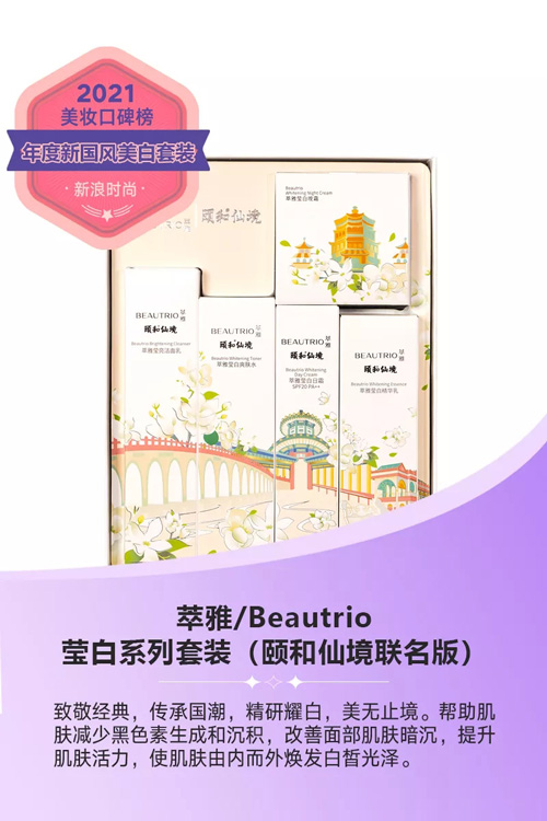 道道网讯 12月15日,“2021新浪美妆口碑榜”如期揭晓,公布最新影响力美妆单品及品牌,引领美容领域新趋势。萃雅的年度明星产品萃雅莹白系列套装(颐和仙境联名版),荣获“2021新浪美妆口碑榜”年度新国风美白套装的殊荣!