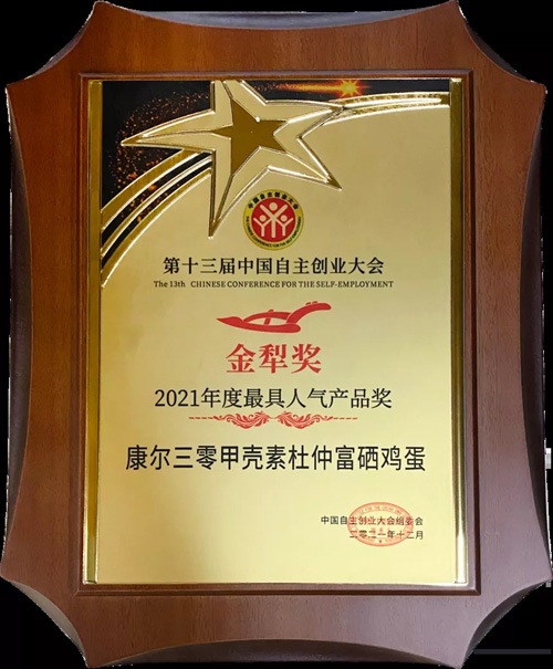 青岛康尔生物工程有限公司凭借极具匠心的海洋科技产品和高度的社会诚信度,得到社会各界的广泛认可与喜爱,荣获第十三届中国自主创业大会金犁奖“年度最具人气产品奖”。