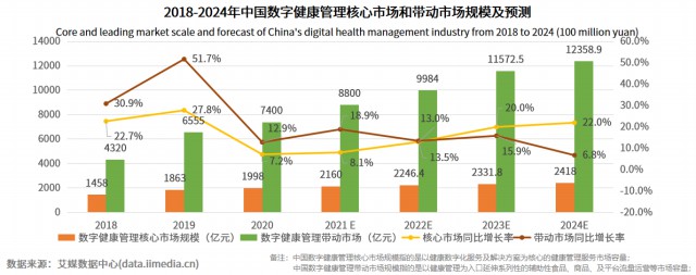 数据显示,2019年面临全球疫情爆发等因素,健康管理核心市场规模增长率瞬间攀升至27.8%,而2020年后稳定增长,市场规模接近2000亿元。艾媒咨询分析师预测,2021年市场规模有望提升至2160亿元,在国民健康管理意识的日益加强以及整体行业的发展驱动下,2024年中国数字健康管理核心市场规模有望达至2418亿元。而随着国民健康管理需求的壮大,围绕健康管理开展的带动产业发展迅速,2024年中国数字健康管理带动市场规模估计超1.2万亿元。数字健康管理行业将成为“大健康经济”发展的新引擎。