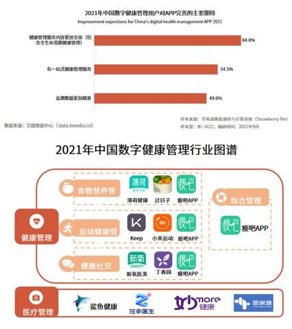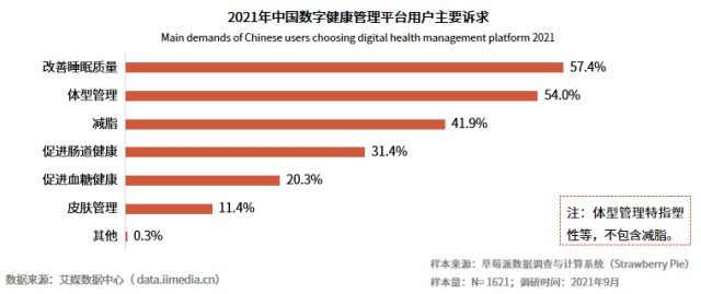 iiMediaResearch(艾媒咨询)数据显示,中国数字健康管理用户主要诉求有六大类,其中改善睡眠(57.4%)、体型管理(54.0%)、减脂(41.9%)较为突出。艾媒咨询分析师认为,数字健康管理平台用户需求明确,提高服务匹配度和体验感是中国数字健康管理平台的关注重点。