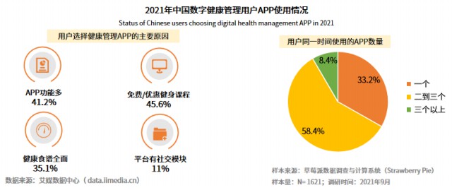 数据显示,数字健康管理平台用户同时使用二个以上APP的用户占6成以上(66.8%),其中使用二到三个APP的用户占比为58.4%。由此看出,中国数字健康管理用户的健康管理需求呈现多元化态势,而数字健康管理平台的单一功能性成为核心痛点。