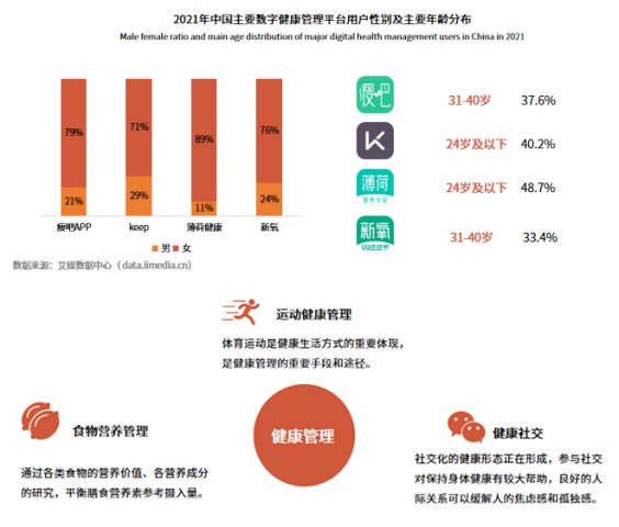 iiMediaResearch(艾媒咨询)数据显示,中国主要的数字健康管理平台用户集中在女性,而不同的APP的年龄层侧重有所不同。以瘦吧APP、Keep、薄荷健康和新氧医美为例,身体新陈代谢较优状态的24岁及以下女性群体喜欢在keep和薄荷健康;而31-40岁的女性群体随着年龄的增长会因雌性激素分泌和代谢功能逐步减弱的问题,出现脂肪组织增多的现象,减脂需求更加强烈,因此这部分群体更热衷集中在瘦吧APP。