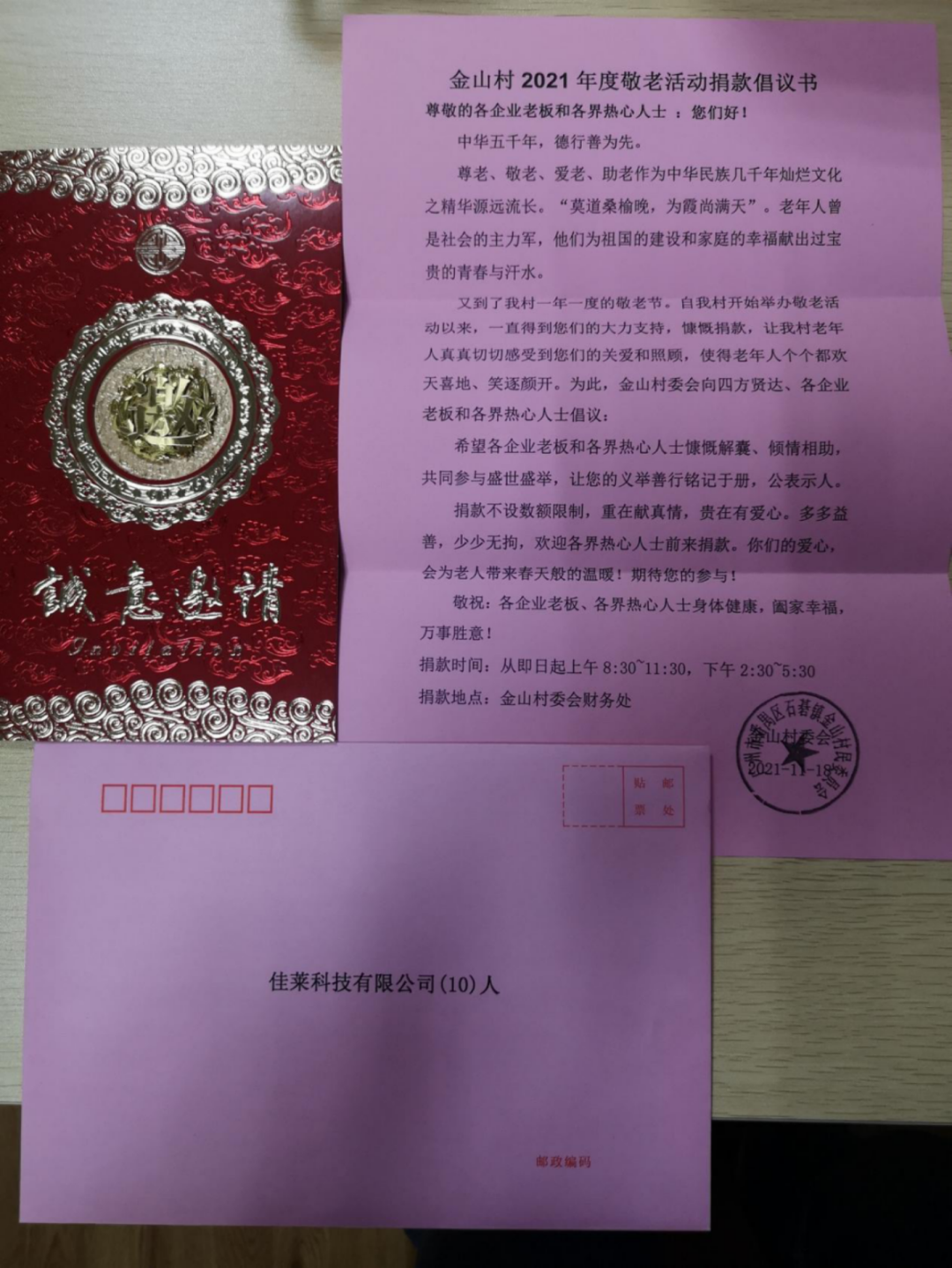 年近岁末,敬老献爱心,佳莱公司公益再行动——公司积极响应金山村村委“2021年敬老倡议书”的号召,特派佳莱代表走进石碁金山村,向该村全体老人居民表达了慰问,并在村委的协助下举行了敬老捐款仪式。