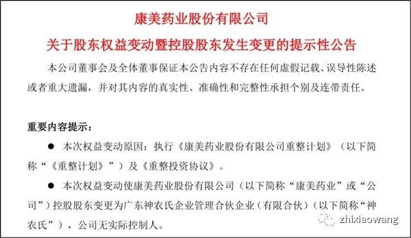 根据公司重整计划及重整投资协议的相关安排,广东神农氏拟以不超过54.19亿元的投资资金对康美药业进行投资,获得康美药业3,509,413,788股的转增股票,占康美药业实施资本公积金转增股票后总股本的25.3134%,为公司第一大股东且可实际支配的上市公司股份表决权足以对公司股东大会的决议产生重大影响,广东神农氏成为公司控股股东。