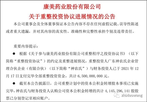 公司重整计划中的资本公积金转增股本事项已实施完毕,广东神农氏与财务投资人认购*ST康美资本公积金转增的共计41.45亿股股票已分别登记至相应账户。康美药业于12月17日收到重整投资人神农氏与财务投资人支付的全部65亿元重整投资资金,其中广东神农氏支付完毕货币资金45.15亿元,并将评估作价9.04亿元的康美(普宁)医院投资管理有限公司100%股权过户至公司名下,合计金额54.2亿元;广发证券等四方财务投资人合计支付完毕货币资金10.81亿元。