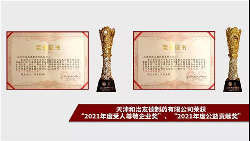 活动中,天津和治友德制药有限公司因多年来始终秉持诚信经营的理念,在全球大健康产业的强大影响力,积极推进企业可持续发展和践行企业社会责任方面的诸多贡献,荣获“创业中国•2021年度受人尊敬企业奖”、“创业中国•2021年度公益贡献奖”。和治友德副董事长鲜胜先生因在推动健康产业蓬勃发展,提升民众健康素养水平、促进社会和谐等方面所做出的贡献,荣获“创业中国•2021年度受人尊敬企业家奖”奖项。