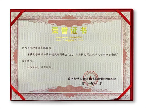 道道网讯 2021年12月,对太阳神来说是一个收获的季节。34年的用心经营和品牌积淀及在模式创新上的积极探索和努力,让太阳神在多个领域脱颖而出,荣获多项大奖。12月初,继荣获“健康中国突出贡献企业”、“智慧中国创新数字化平台”之后,太阳神再次荣获“2021中国社交商业数字化创新杰出企业”的大奖。