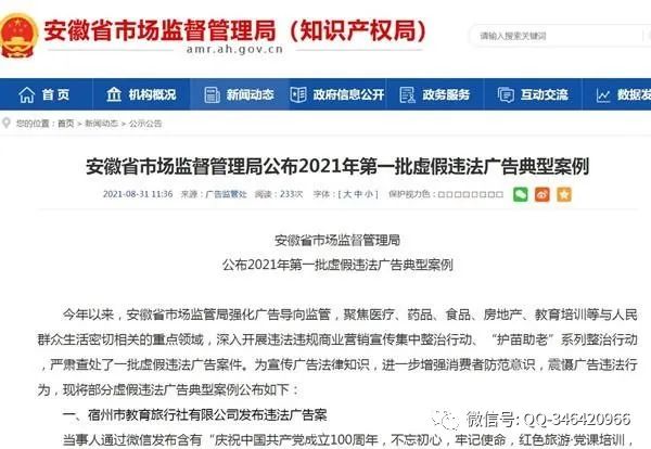 据安徽省市场监管局网站消息,今年以来,安徽省市场监管局强化广告导向监管,聚焦医疗、药品、食品、房地产、教育培训等与人民群众生活密切相关的重点领域,深入开展违法违规商业营销宣传集中整治行动、“护苗助老”系列整治行动,严肃查处了一批虚假违法广告案件。