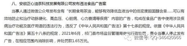 其中,安徽正心油茶科技发展有限公司(以下简称安徽正心油茶)通过微信公众号发布含有“长期食用茶油,能够有效降低血液当中的低密度胆固醇含量……可以有效地防止和治疗动脉硬化、高血压、心脏病、心力衰竭等疾病”内容的广告,构成在食品广告中使用涉及疾病治疗功能及医疗用语的违法行为,违反了《中华人民共和国广告法》第十七条的规定。依据《中华人民共和国广告法》第五十八条的规定,2021年6月,祁门县市场监督管理局做出行政处罚,责令当事人停止发布广告,在相应范围内消除影响,并处罚款1.65万元。