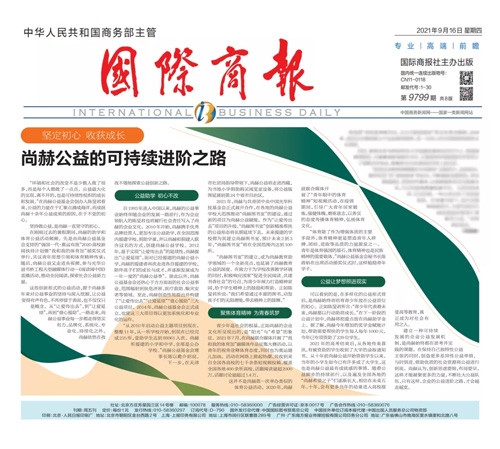 道道网讯 9月16日,中华人民共和国商务部主管《国际商报》以《坚定初心 收获成长——尚赫公益的可持续进阶之路》为题,从“公益助学”“聚焦体育精神”“公益让梦想照进现实”三个方面,报道尚赫多年来诚信、稳健、踏实开展公益事业,不断创造差异性公益举措,可持续进阶的公益之路。