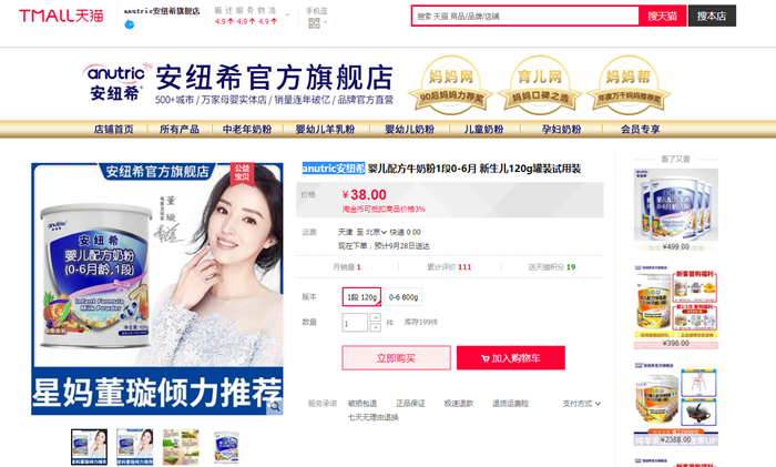 据悉,安纽希(天津)婴幼儿食品科技有限公司目前在天猫设有“安纽希官方旗舰店”,主要经营婴幼儿羊乳粉、婴幼儿奶粉、儿童奶粉、孕妇奶粉等。其中,安纽希婴儿配方奶粉(0-6月龄,1段)宣称“星妈董璇倾力推荐”。