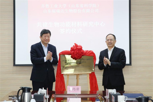 齐鲁工业大学(山东省科学院)党委副书记刘永波与福瑞达医药集团党委书记、董事长贾庆文为研究中心揭牌