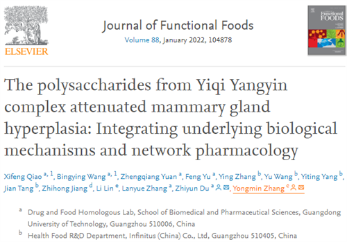 另一篇在SCI核心期刊《Journal of Functional Foods》发表的论文《The polysaccharides from Yiqi Yangyin complex attenuated mammary gland hyperplasia:Integrating underlying biological mechanisms and network pharmacology》则主要研究由黄精、枸杞子、党参、地黄组成的益气养阴复合多糖对女性乳腺增生的潜在治疗作用,该研究揭示了相关的调控信号通路,该复合多糖作用的关键靶点可能为乳腺增生的健康食品开发提供新的思路。