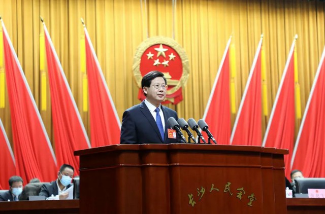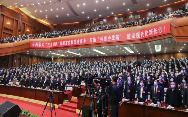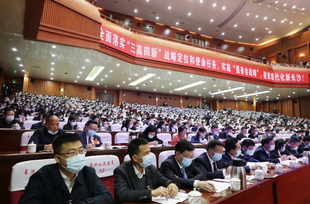 长沙市人大常委会党组书记、主任谢卫东主持会议并宣布大会开幕。会场全体起立,高唱国歌。在热烈的掌声中,长沙市人民政府市长郑建新作政府工作报告。报告共分四部分:一是本届政府及2021年工作回顾;二是未来五年的发展目标和重点任务;三是2022年工作重点;四是切实加强政府自身建设。郑建新说,2021年是党和国家历史上具有里程碑意义的一年,也是本届政府的收官之年。我们深入贯彻习近平总书记对湖南重要讲话重要指示批示精神,全面落实“三高四新”战略定位和使命任务,融入新发展格局,推进高质量发展,实现“十四五”良好开局。特别是省第十二次党代会明确实施强省会战略,为长沙发展注入强大动力、赋予新的使命。全市上下要深入落实强省会战略,以实干抢抓机遇,用担当迎接挑战,进一步强化省会意识、彰显省会作为,奋力在全国争先进、在区域作示范、在全省当标杆。