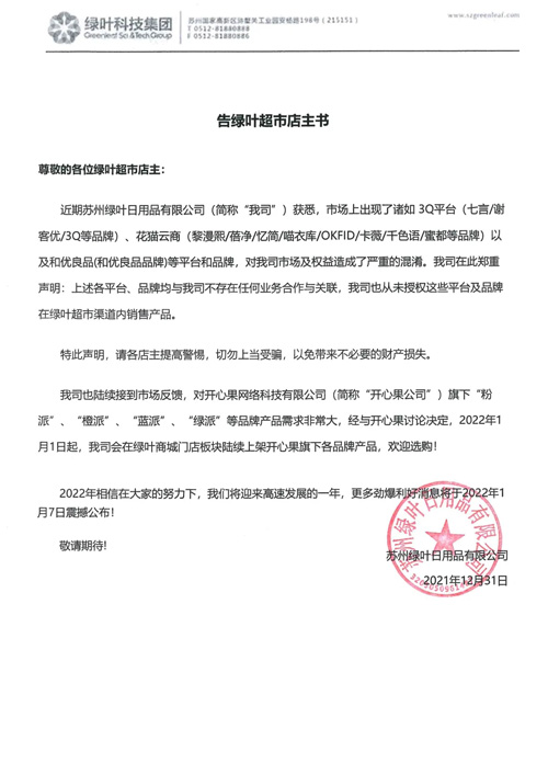 道道网讯 2022年1月4日,绿叶科技集团官网发布重要公告《告绿叶超市店主书》,以保障和维护广大绿叶超市店主的合法权益。敬请各绿叶店主和广大消费者仔细阅读、相互转告,共同维护声誉良好的绿叶市场。