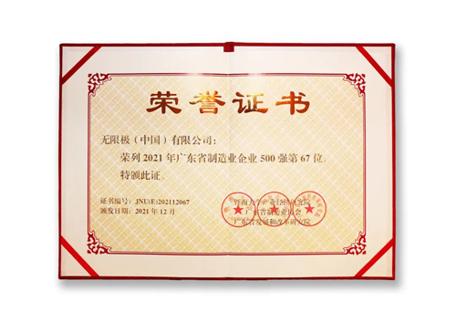 无限极荣列2021广东省制造业企业500强第67位并获证书