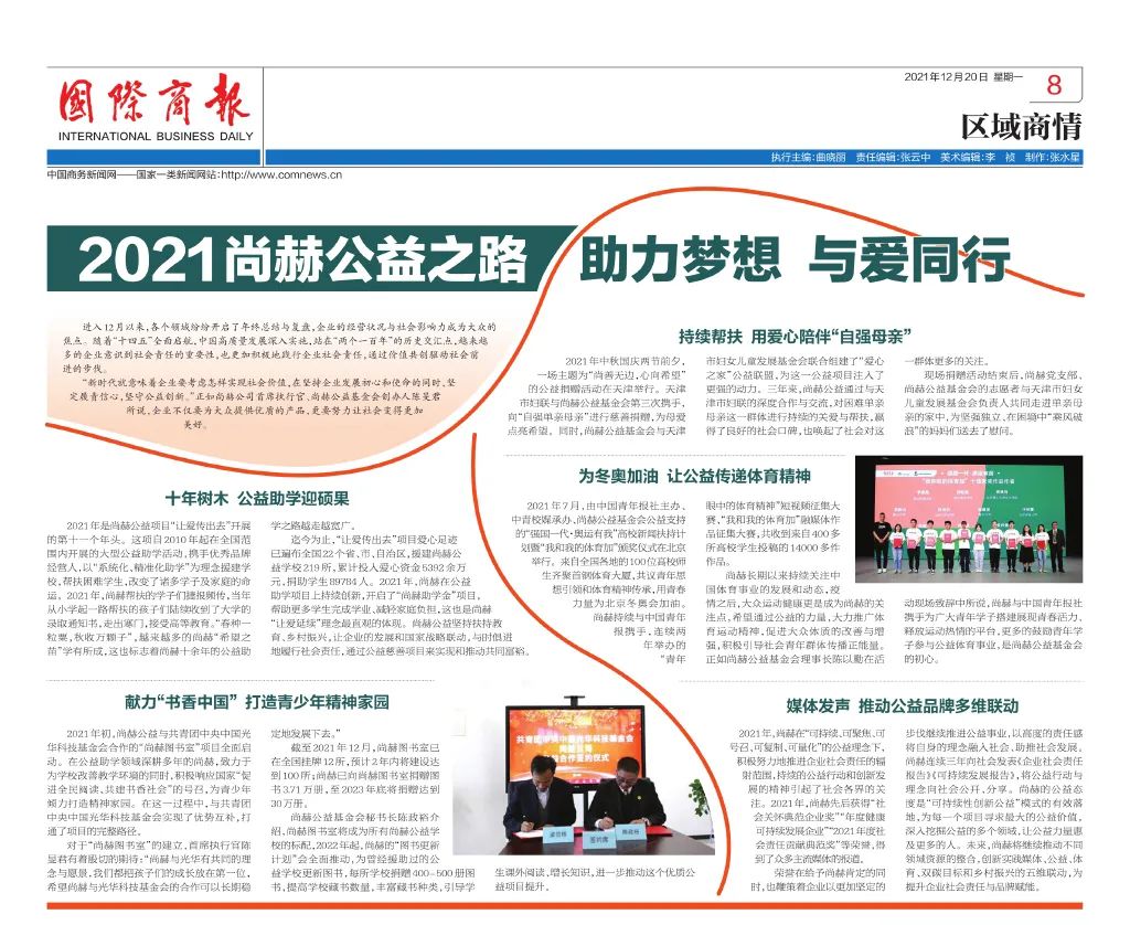 2021年,尚赫在“可持续、可聚焦、可号召、可复制、可量化”的公益理念下,积极努力地推进企业社会责任的辐射范围,持续的公益行动和创新发展的精神引起了社会各界的关注。2021年,尚赫先后获得《中国经营报》颁发的“社会关怀典范企业奖”、《界面新闻》颁发的“年度健康可持续发展企业”、《华夏时报》颁发的“2021年度社会责任贡献典范奖”等荣誉,得到了众多主流媒体的报道。