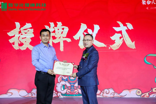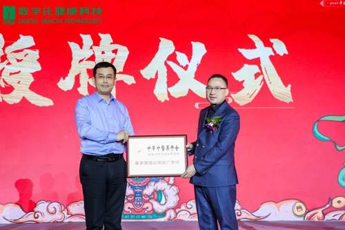 王军教授为数字化健康科技颁发“中华中医药学会筋膜学协同创新共同体康养领域应用推广单位”授权牌和证书