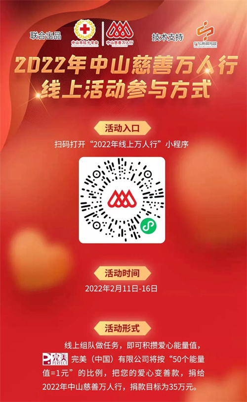 其中,慈善万人行微信小程序自2月11日上线以来,参与“云巡游”人数达数十万,通过灵活有趣的互动积攒爱心能量值,由完美公司按“50个能量值=1元”的比例换算成善款,捐给2022年中山慈善万人行,爱心捐步的捐款目标为35万元。