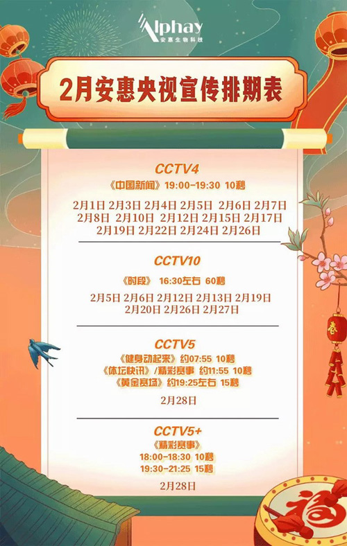 道道网讯 春节即将来临,正是亲朋好友举家团聚、推杯换盏的幸福时刻,大家包饺子、看烟花、吃团圆饭,不亦乐乎。 还有,相伴多年的安惠央视宣传记得要一起看啊。2022年,除了CCTV4、CCTV10,大家还能在CCTV5和CCTV5+看到安惠的身影。2022年是体育年,冬奥会、亚运会、世界杯、大运会等好戏连台,邀请您和安惠一起关注。 为梦想奔跑,和民族企业安惠一起为体育健儿加油。2月份的排期表来了!