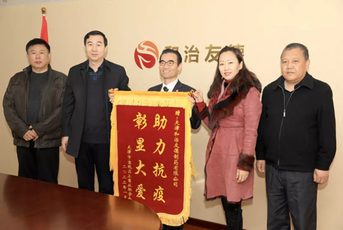 道道网讯 2022年2月8日,恰逢新春喜庆开工,天津市宝坻区工商联党组书记吴凤双、区工商联副主席孙景太、区工商联副主席王永盛等领导一行在开工后的第一时间莅临天津和治友德制药有限公司宝坻工厂指导工作,帮扶企业高质量发展,并代表区工商联赠送“助力抗疫彰显大爱”的锦旗,对和治友德近期捐赠抗疫爱心物资表示真挚感谢。和治友德董事长韩金明、副总裁郅群热情接待区工商联领导一行。