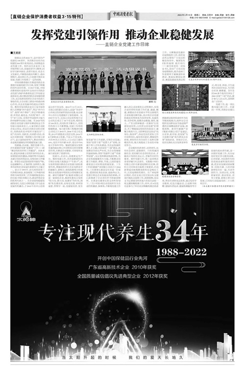 中国消费者报2022年315特刊 除了不断升级产品品质、提升养生服务,34年来,太阳神始终坚持践行社会责任,依法经营、诚信经营,接受社会监督;公平竞争,维护市场环境;服务到位,确保消费者权益;规范生产,保证产品质量;严格自律,感恩回报社会,履行责任,承担责任。这些,都是太阳神一以贯之的企业生存准则。