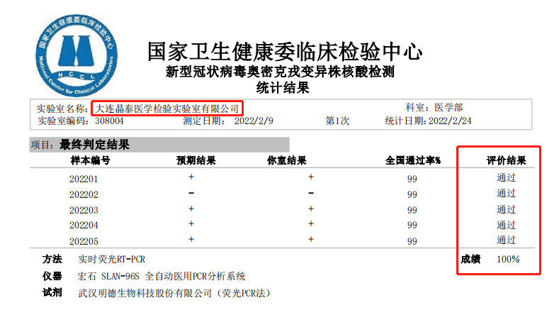 国家卫健委临检中心发布了2022年2月“新型冠状病毒奥密克戎变异株核酸检测”室间质量评价结果。双迪旗下晶泰医学检验实验室检测回报结果与官方结果完全一致,再一次满分通过。