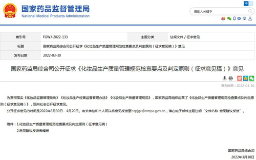 道道网讯 2022年3月30日,为贯彻落实《化妆品监督管理条例》《化妆品生产经营监督管理办法》《化妆品生产质量管理规范》,国家药监局组织发布《化妆品生产质量管理规范检查要点及判定原则(征求意见稿)》(以下简称《征求意见稿》),征求意见为2022年3月30日—4月20日。