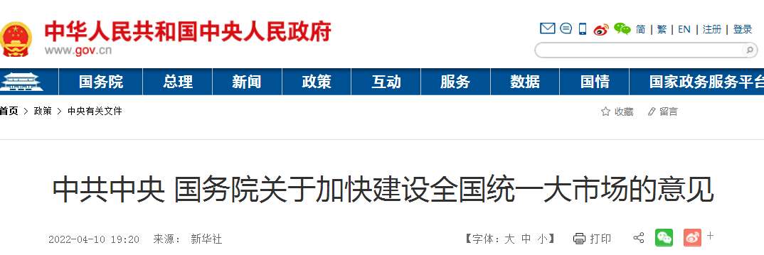 道道网讯 4月10日,《中共中央 国务院关于加快建设全国统一大市场的意见》(简称《意见》)发布。