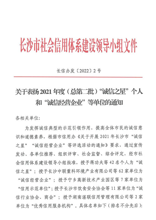 道道网讯 近日,长沙市社会信用体系建设领导小组办公室发布《关于表扬2021年度(总第二批)“诚信之星”个人和“诚信经营企业”等单位的通知》,绿之韵集团董事长胡国安凭借引领企业在诚信体系建设领域所取得的优异成果受到政府表彰,荣获长沙市“诚信之星”荣誉表彰。
