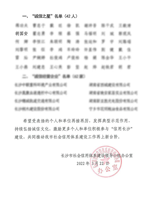 据了解,“诚信之星”“诚信经营企业”评选活动是全面推进长沙市社会信用体系建设,大力弘扬社会主义核心价值观,进一步加强社会诚信建设的有力措施。此次,评选活动通过宣传发动、各单位推荐、组织评审、社会监督多个环节,经长沙市社会信用体系建设领导小组综合评定最终决出信用示范单位7家,诚信经营企业62家,诚信行业协会、商会11家,优秀信用服务机构2家以及诚信之星42名。