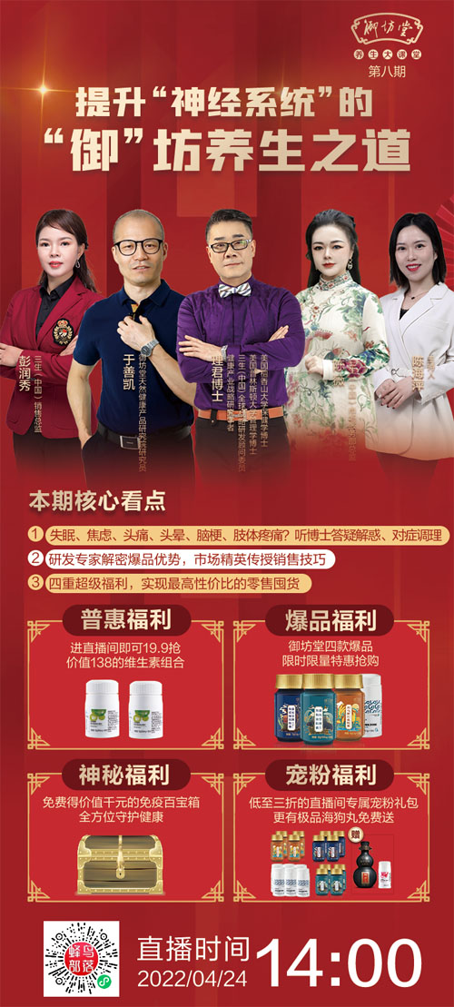 为您解锁神经系统的养生之道!失眠?焦虑?头痛?头晕?听理博士为您答疑解惑,对症调理!一起探寻神经系统调理养护之法!研发专家坐阵,深度解密爆品优势市场精英现场传授实战销售技巧更有四重超级福利大放送帮你实现最高性价比的零售囤货!请锁定蜂鸟直播!