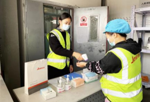 物资储备方面,储备了满足三个月使用的防护口罩、手套、红外测温仪、消毒剂、喷雾设备等防疫物资。人员控制方面,进场人员每日必查健康码、行程码、场所码和温度测量。