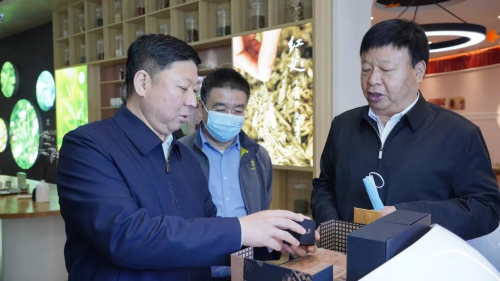 在金木博览馆内,王建峰详细了解了安国中医药发展的历史,并对金木集团进行产业升级,在供给侧改革中实现高品种产品突围的做法,给予了肯定。对于金木集团贯穿大健康全产业链条的做法,王建峰表示肯定。在企业产品展示区,他详细了解了各种大健康产品的组成和工艺,对集团依托河北省中药材产业技术研究院实现科技创新,充满了兴趣。