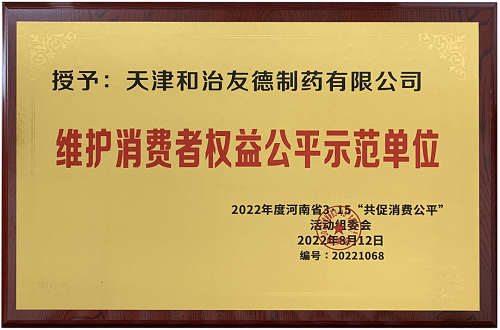 道道网讯 近日,2022年度河南省3.15“共促消费公平”活动组委会授予天津和治友德制药有限公司“维护消费者权益公平示范单位”荣誉奖牌。