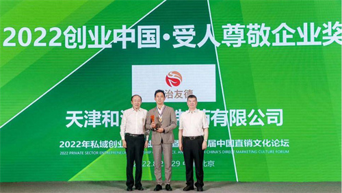 作为大健康行业知名企业,天津和治友德制药有限公司受邀参加本次活动。鉴于和治友德公司秉承“弘扬养生文化,造福人类健康”的初心使命,坚持全球化战略,推动企业提质升级可持续发展取得的一系列发展成就,本次活动中,天津和治友德制药有限公司荣获“2022创业中国•受人尊敬企业奖”,鲜胜副董事长荣获“2022创业中国•受人尊敬企业家奖”,韩颖部长荣获“2022创业中国•行销教育创新奖”。